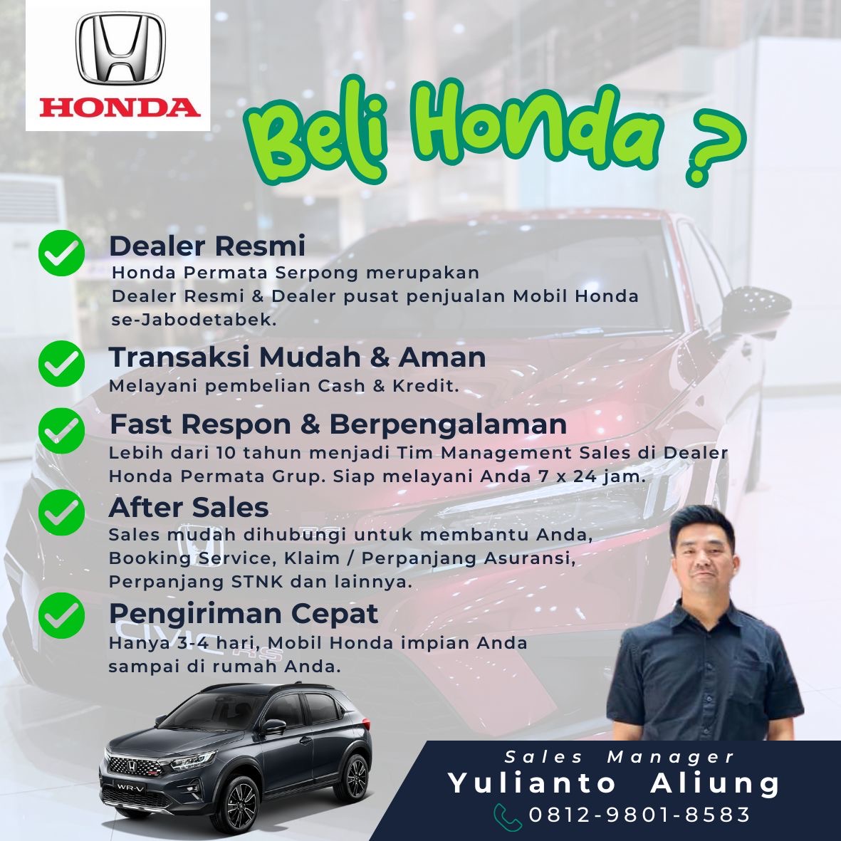 Perkenalkan saya YULIANTO SALES MANAGER HONDA PERMATA SERPONG sejak 2020. Dapatkan benefit :